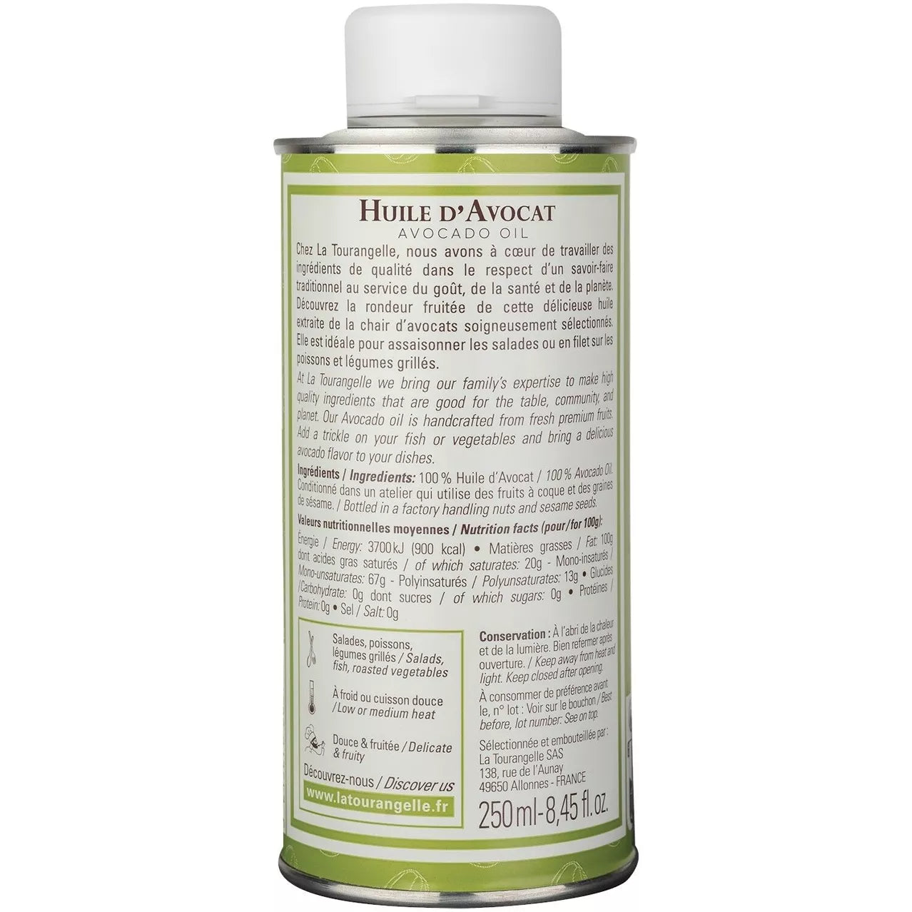 La Tourangelle nerafinuotas avokadų aliejus gaminamas tradiciniu būdu iš šviežių avokadų minkštimo, išlaikant visas naudingas medžiagas ir natūralų skonį. Šis aliejus yra itin universalus: