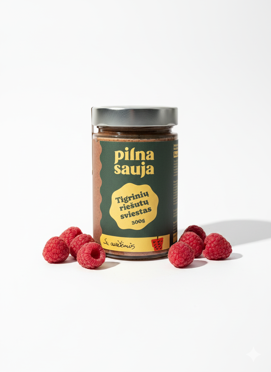 Gurmaniškas riboto leidimo skonis. Tik trys premium ingredientai ir jokių nesamonių! Aukčiausios kokybės, natūraliai saldus, pagamintas iš kruopščiai atrinktų tigrinių riešutų (dar vadinamų valgomosiomis viksvuolėmis) šakniagumbių, gryno avokadų aliejaus ir lietuviškų žemoje temperatūroje džiovintų aviečių miltelių. Vitaminų ir skaidulų bomba!